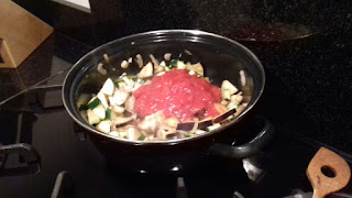 4. Voeg vervolgens de blokjes courgette en aubergine toe en bak ze ongeveer 5 minuten mee. Probeer de blokjes goed te husselen, anders wordt niet alles tegelijk gebakken. Zorg ook dat je de aubergine goed gaar laat worden. Deze kun je namelijk niet rauw eten, daar zit een giftig stofje in. Dus laat het goed doorbakken op een middelhoog vuur.